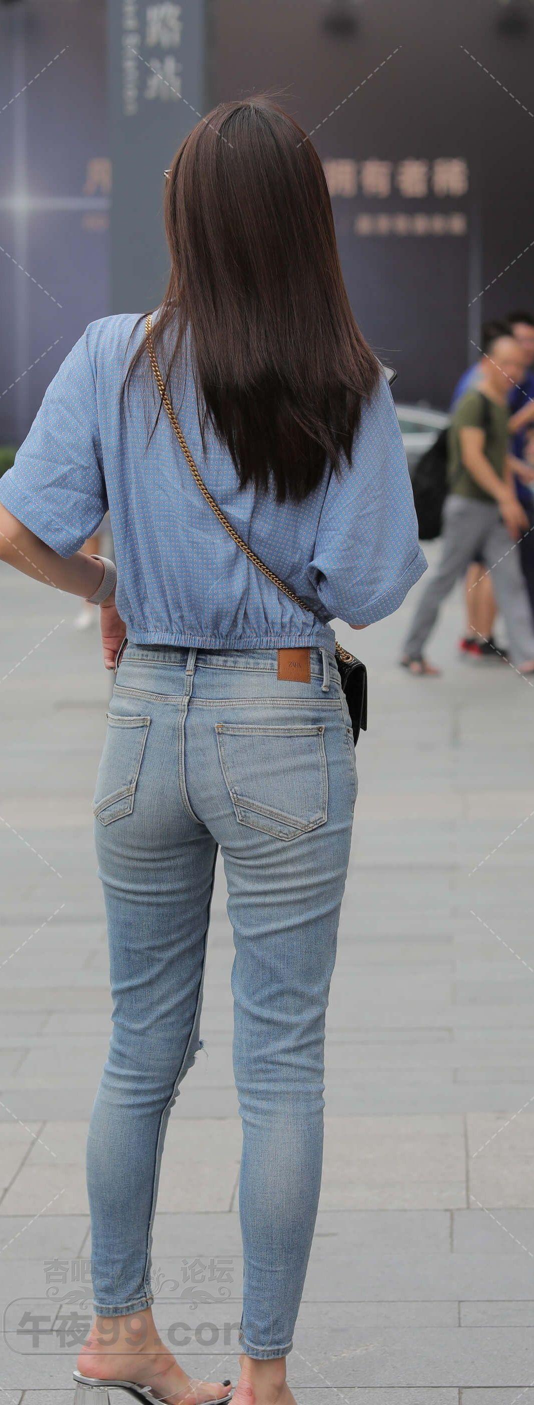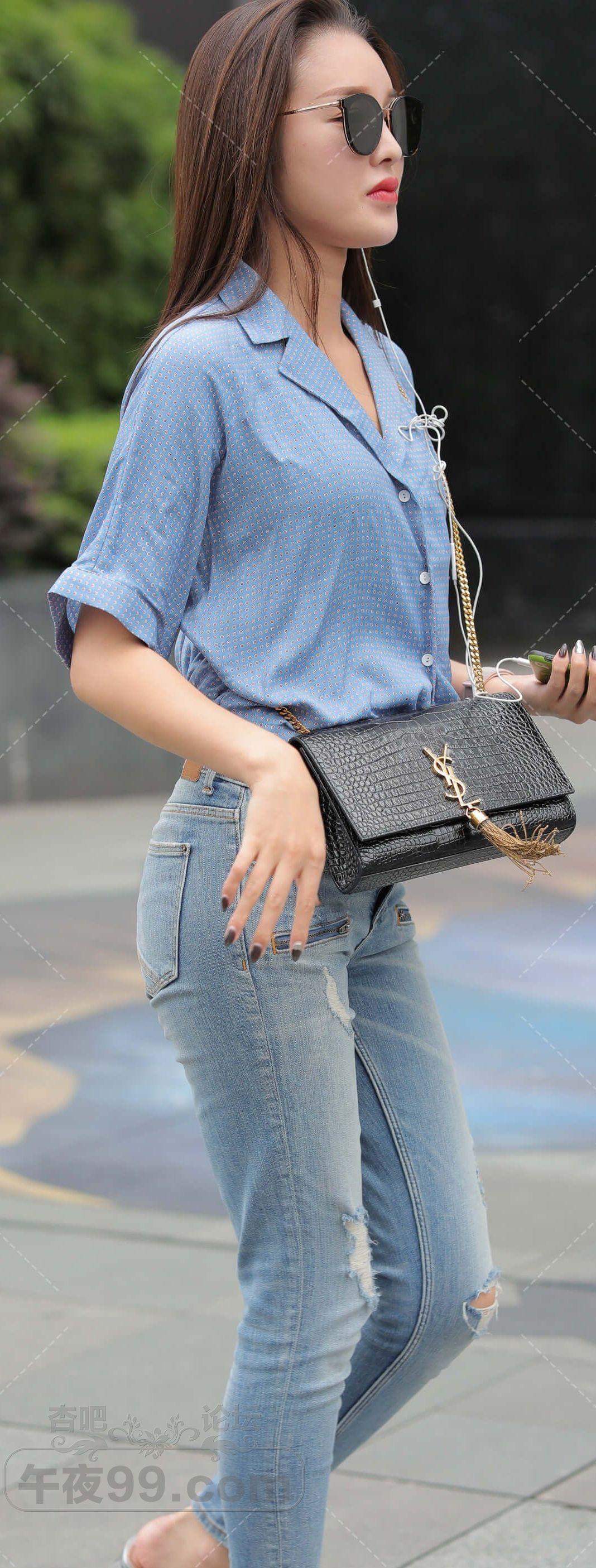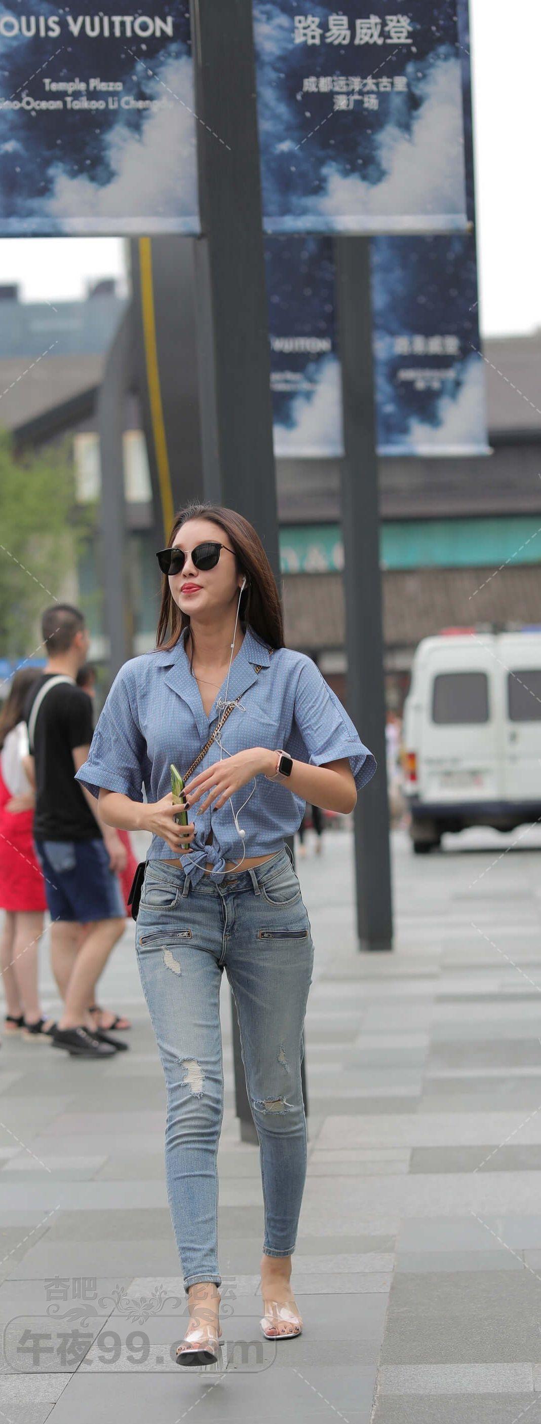 蓝色短袖牛仔紧身裤墨镜长发少女路过【10P】